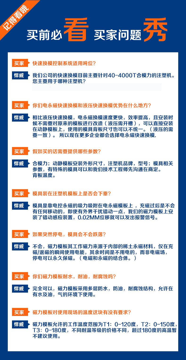 悍威磁電有多年從事電永磁相關(guān)產(chǎn)品研制的經(jīng)驗(yàn),其電永磁快速換模系統(tǒng)完全按照國(guó)際標(biāo)準(zhǔn)設(shè)計(jì)制造,精益求精,整套系統(tǒng)的性能、質(zhì)量和安全保護(hù)裝置毫不遜色于國(guó)際知名品牌,適用于50噸—3200噸注塑機(jī)使用。