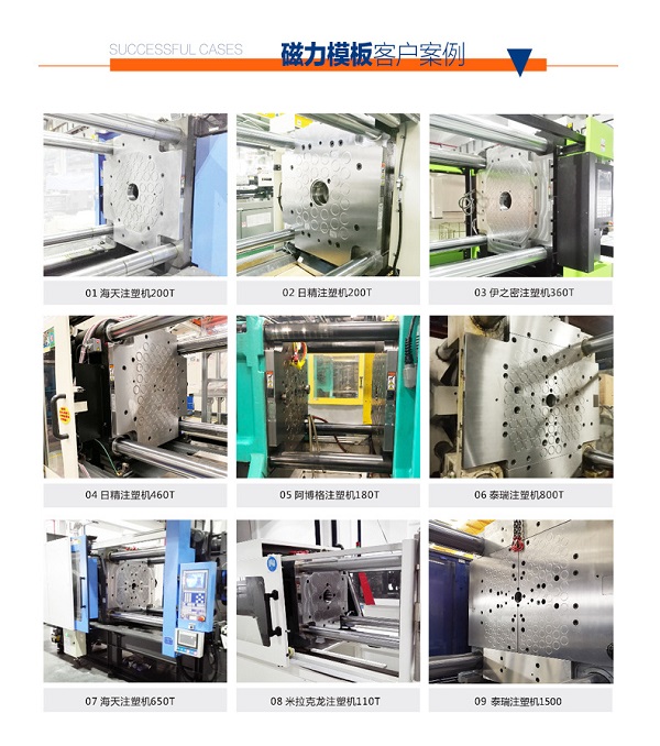 該系統的特點是:結構和控制非常簡單,沒有任何機械的夾緊元件和動作,在模具背板與吸盤磁極的接觸面上,無論是中心還是外圍,都有電永磁夾緊。 適用于各種形式,規格的注塑機。